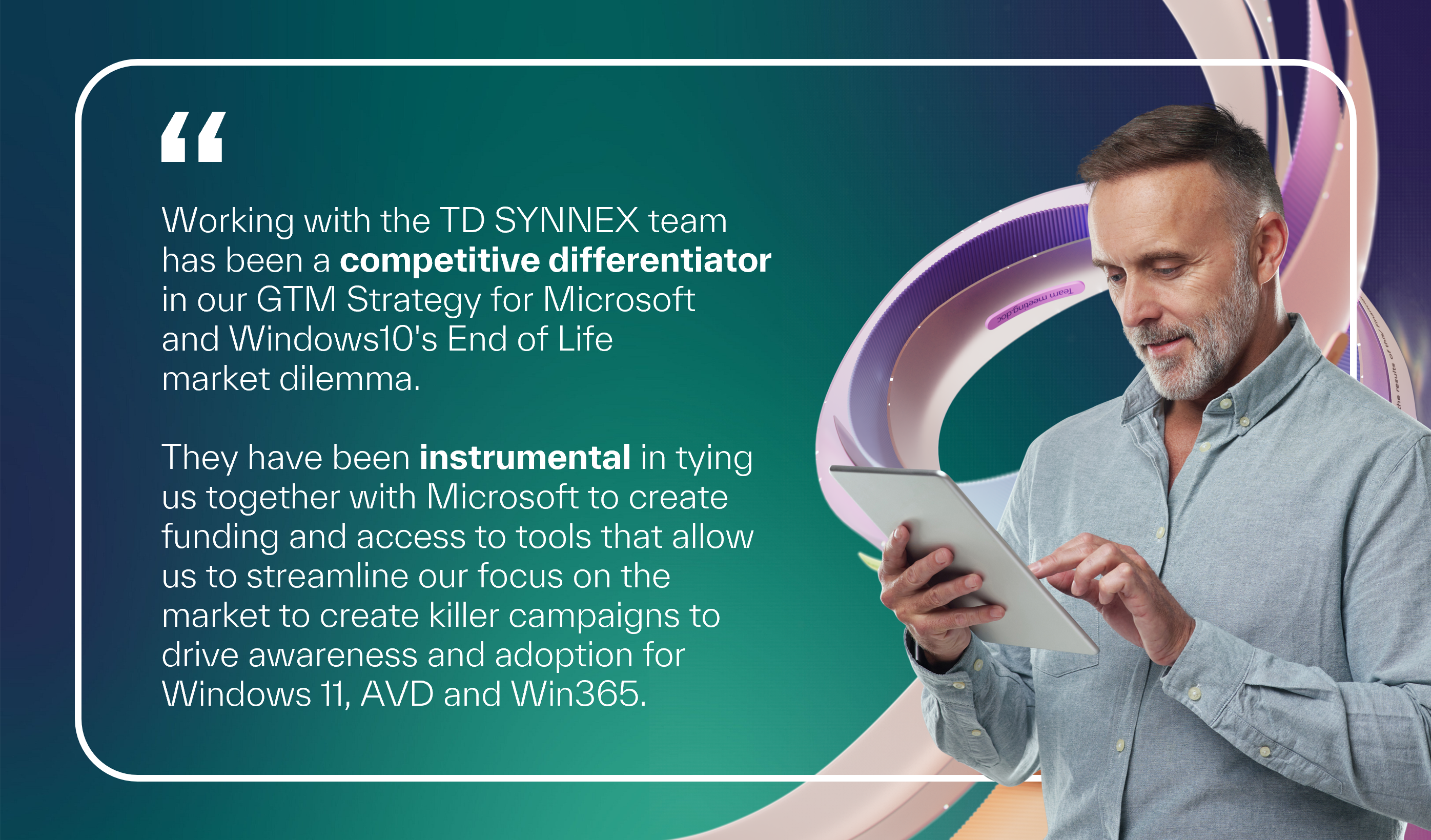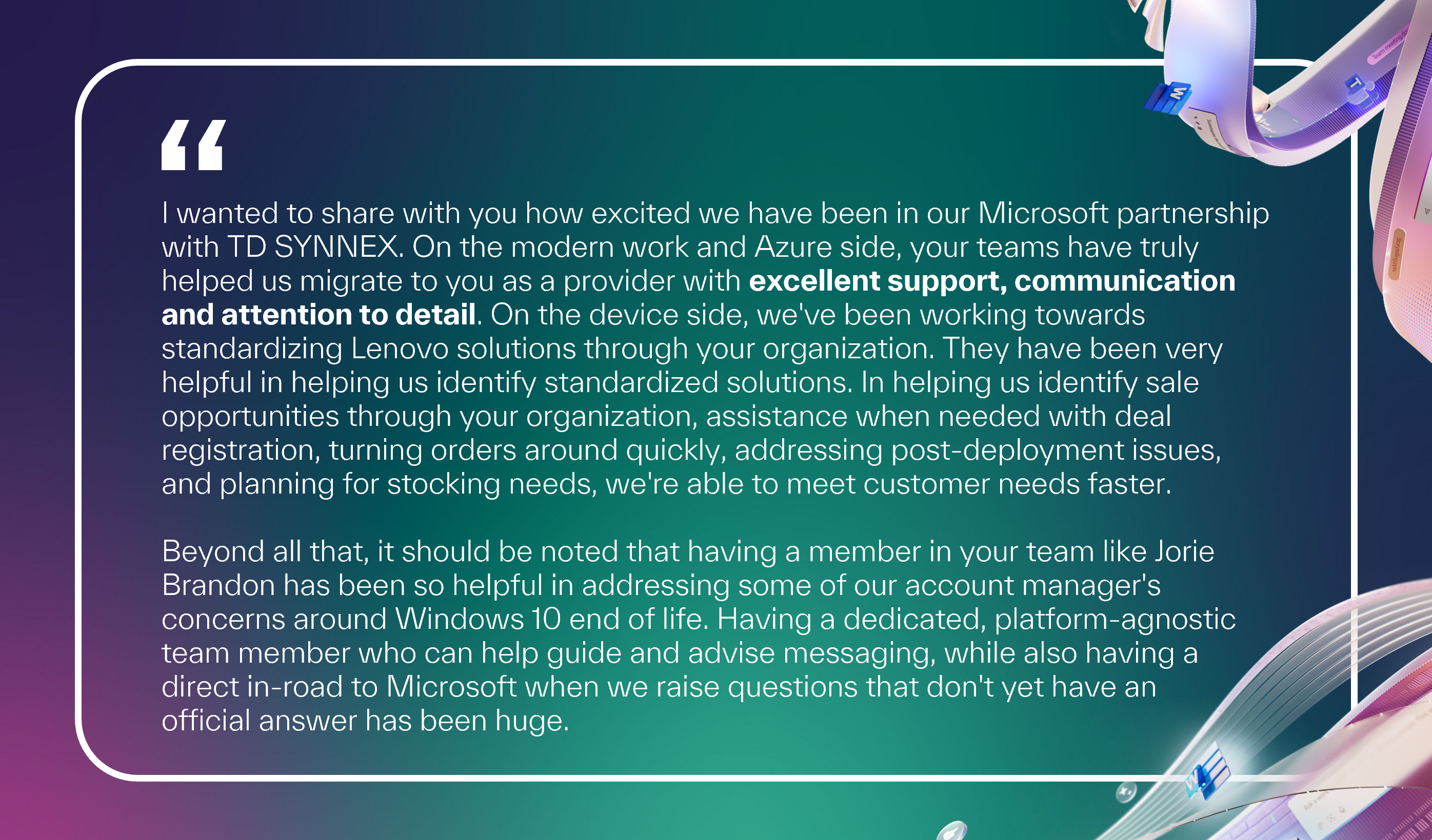 TD SYNNEX is proud to support thousands of Microsoft partners across the world – not just with scale, but with purpose. Whether it’s accelerating cloud adoption or delivering smarter device experiences, our approach combines data-driven intelligence, industry-leading platforms, and real human expertise.